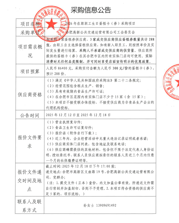 高新公交2026年在職職工生日蛋糕卡(券)采購項目公告